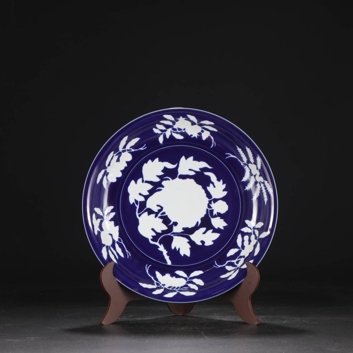 - 明代 宣徳霽藍釉留白剔刻花卉紋大盤 高7㎝ 直径41㎝ 唐物 箱付 陶磁器 古美術 置物 RG1019