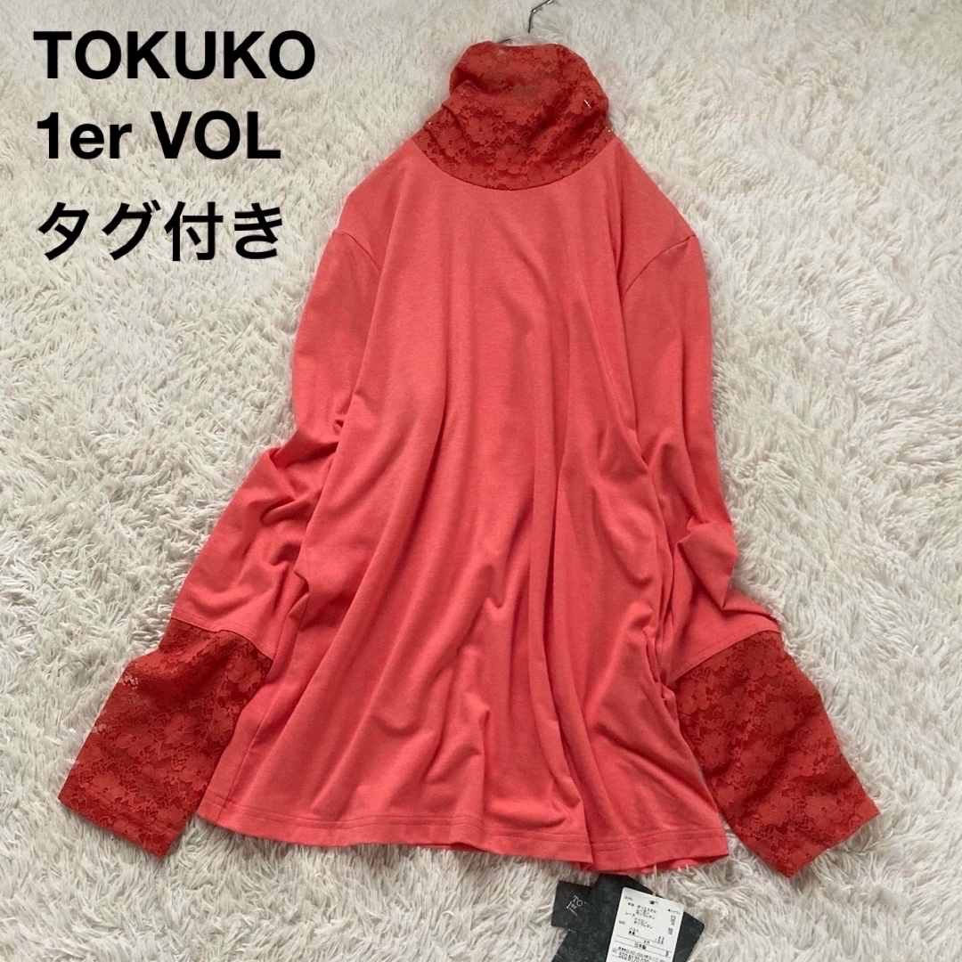 - *タグ付き トクコプルミエヴォル ハイネックレース切替カットソー プルオーバー 日本製 9号 朱色 TOKUKO 1er