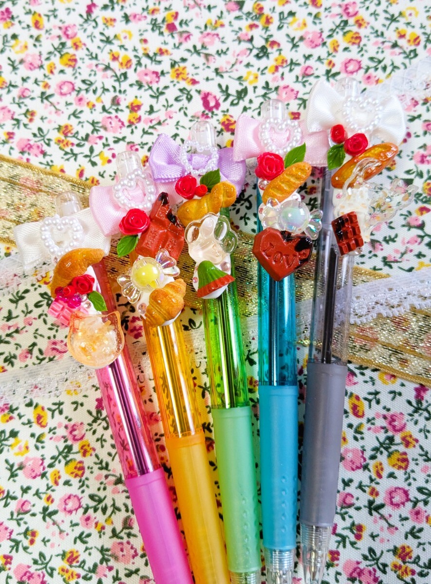 > スイーツデコ月☆ボールペン☆5本セット☆リボン☆フェイクスイーツ☆黒☆