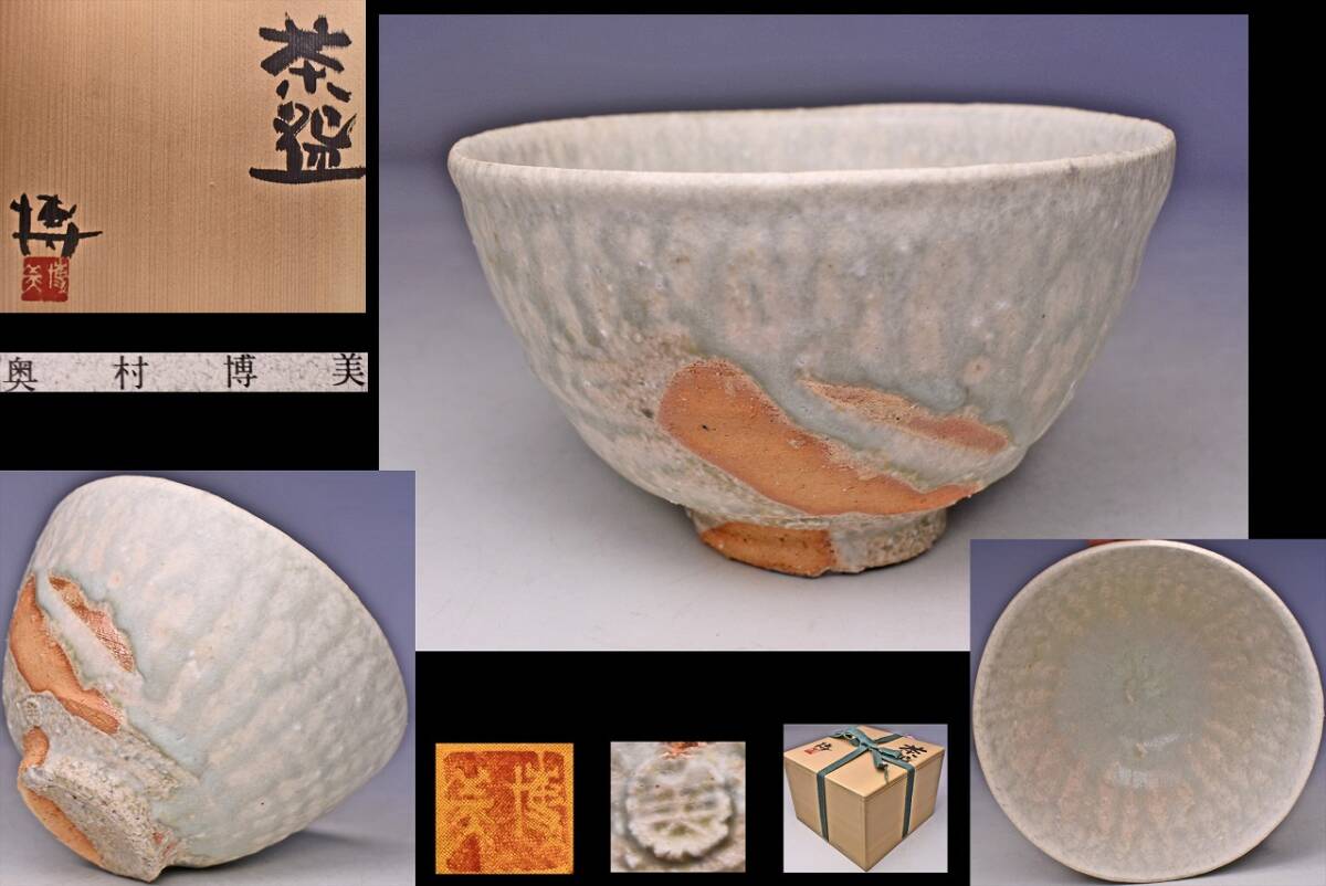 > 奥村博美 ★ 灰釉 茶碗 ★ 共箱 共布 栞 ★ 造形 流れる様な景色の素晴らしい逸品 ★ 茶道具 ★ 京都 亀岡 ★