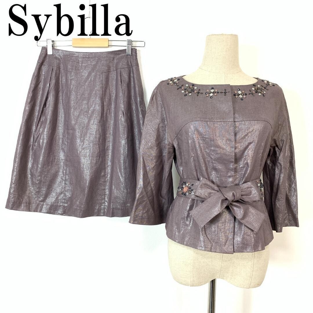 - LA6036 Sybilla シビラ スカート セットアップ 光沢感有 麻 コットン ビジュー付き ビーズ刺繍パープル系 M