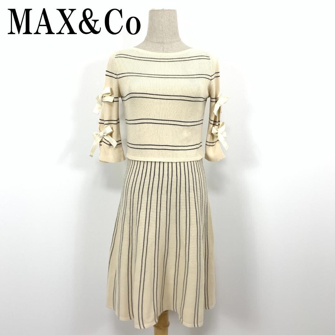 - LA5839 マックスアンドコー 半袖リブ デザインワンピース MAX&Coボーダー ストライプ 切り替えデザイン 紐リボン コットン100%ベージュ XS