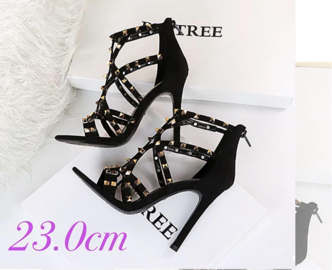 - レディース サンダル ハイヒール 美脚 スタッズストラップ ブラック