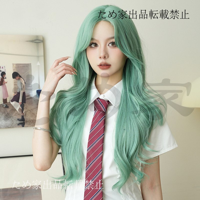 - 新品人毛 ミントグリーン ロングカールヘア 中分ウェーブでエレガントな雰囲気 つむじ部分手植え 自然に見えますフルウィッグ