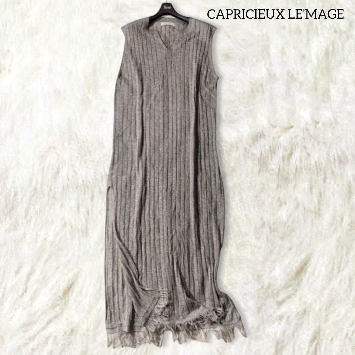 - 66 【CAPRICIEUX LEMAGE】 カプリシューレマージュ フリンジ ニットワンピース ロング グレー ニット リブ Iライン ノースリーブ