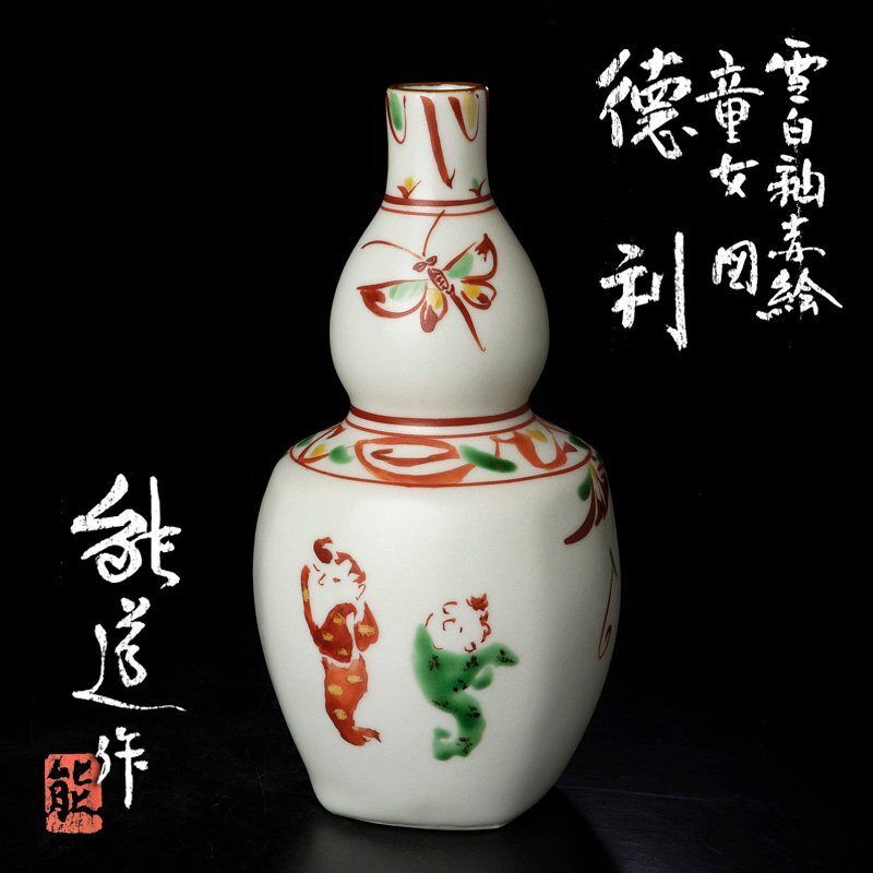- ★【古美味】人間国宝 藤本能道 雪白釉 赤絵 童女図 徳利 茶道具 保証品 rM7O