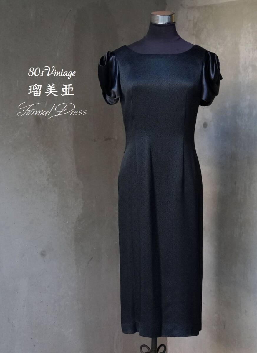 - 80s ヴィンテージ 瑠美亜 黒 袖 腰リボン マキシドレス 演奏会 発表会 9AR S M