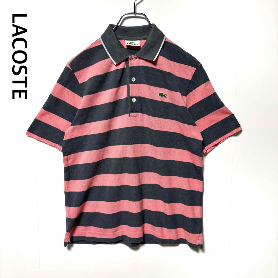 - *ラコステ LACOSTE 鹿の子素材 半袖ポロシャツ 太ボーダー ワニロゴ 襟裏プリント 3=Mサイズ相当 グレー ピンク