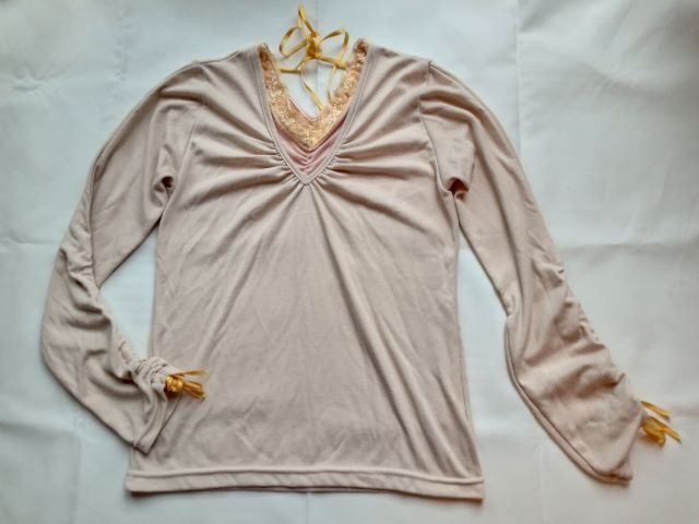 - LAZY DAISY ベージュ×ピンク Vネック長袖Tシャツ M レースリボン