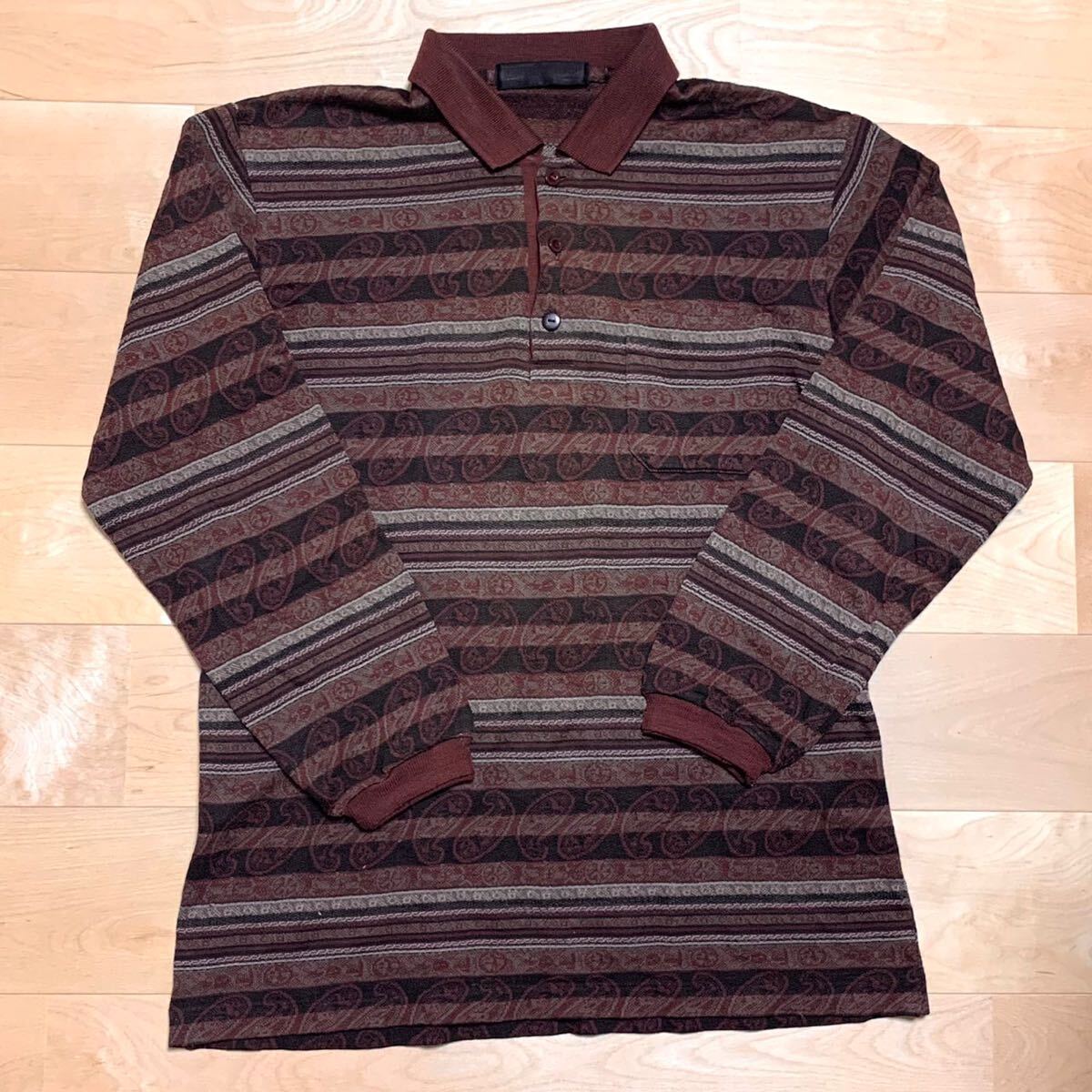 - 長袖カットソー ブラウンボーダー 茶色ペイズリー 長袖ポロシャツ アクリルウール