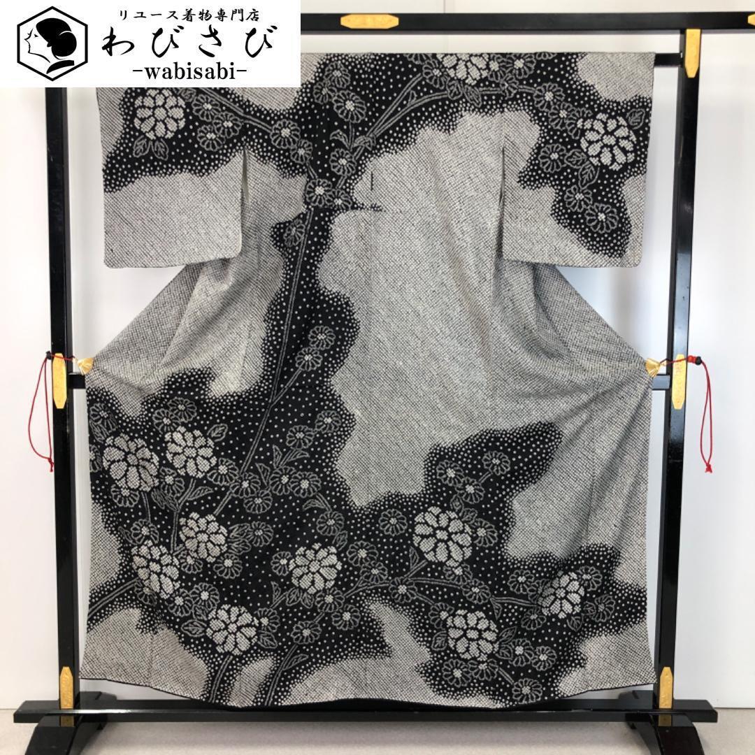 > 訪問着 総絞り 花柄模様 黒色 モノトーン K-4777 着物 きもの kimono 和服 和装 中古 リサイクル着物 【送料無料】