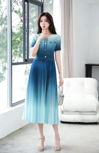 - 2505レディーストップスプリーツpleats半袖ワンピース肌触り弾力ドレープ性がいい可愛いブルー系
