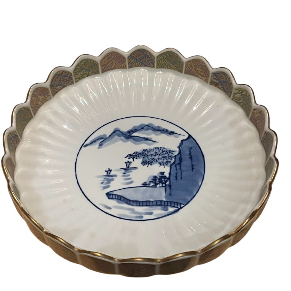- 有田焼 龍峰窯 金彩・染付山水画 菊形深皿(飾り鉢)