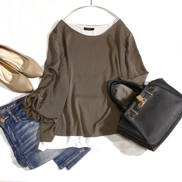 > 美品 7-IDコンセプト 7-ID concept. 大きいサイズ 13号 デザインスリーブ とろみ カットソー XL 春 夏 25D05