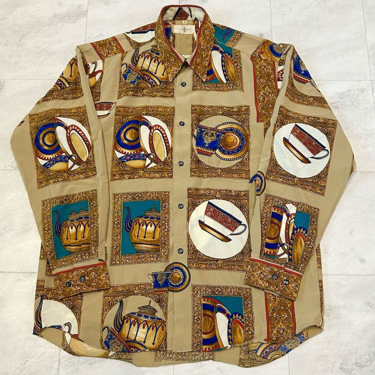 > T's CLUB DIVISION 総柄 柄シャツ 食器柄 茶器 レトロ アート ビンテージ 長袖シャツ ポリエステル100%
