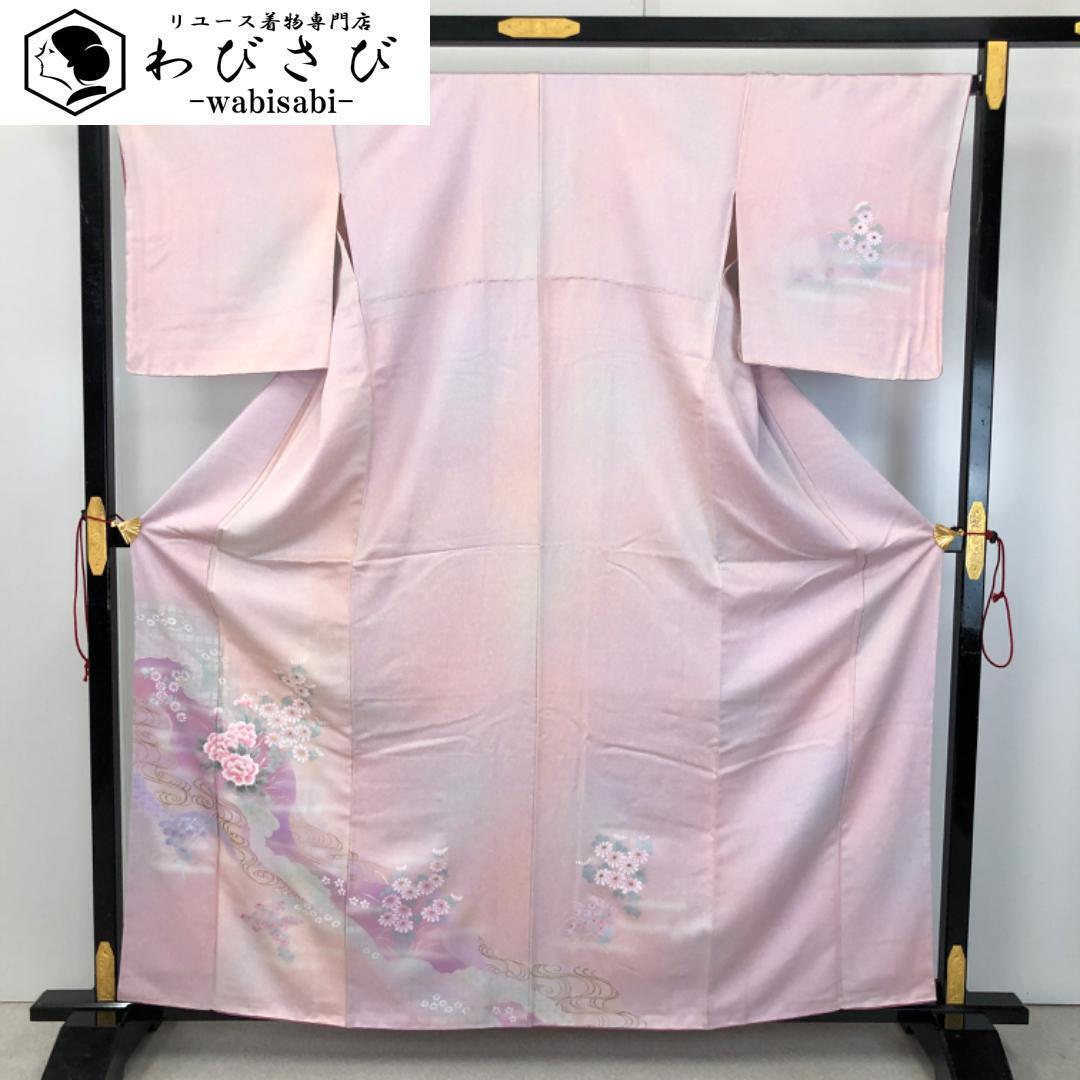 > 訪問着 流水に美しい花模様 花七宝 白梅色 金銀糸 K-4795 着物 きもの kimono 和服 和装 中古 リサイクル着物 【送料無料】
