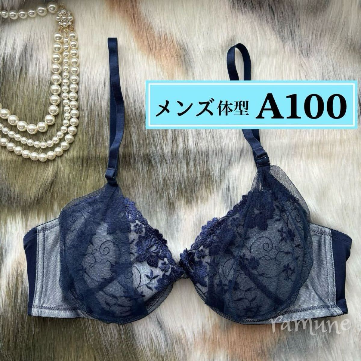 - 【メンズ A100 紺】新品 男性用ブラジャー チュール 刺繍 メンズ体型 取り外せるパッド付き メンズブラ 下着 アンダー大きめ 男性向け