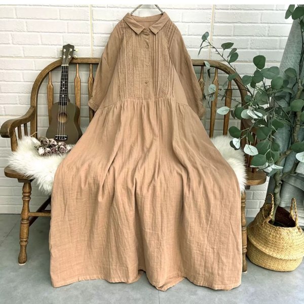 - yy ロングワンピース ゆったりダブルガーゼ レース ふんわり アンティーク風 ロマンファッション 純色 綿100% カーキ色系