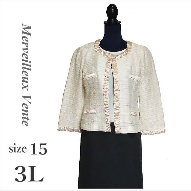 > 〔Merveilleux Vente〕アイボリーベージュ織り込みノーカラージャケット 八分袖 メルヴェイユヴァント ゆったりサイズ 15 ☆送料込み