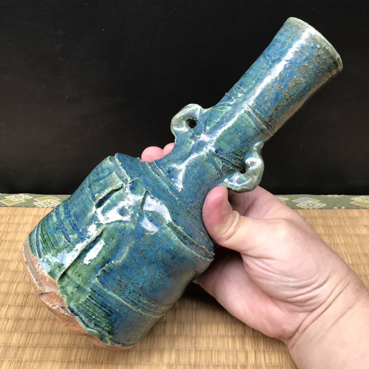 - 青織部砧きぬたの花入れ花瓶、作家物?砧形 一輪挿し 花瓶(R70521_D)