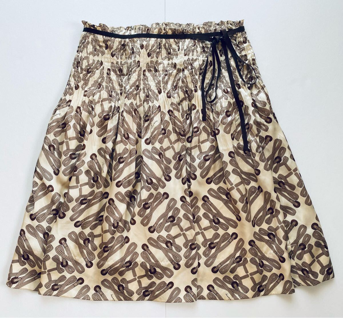 > BURBERRY LONDON バーバリー ソフトプリーツ スカート 総柄 絹 シルク 100% ベルト&ロゴデザイン リボンベルト付き