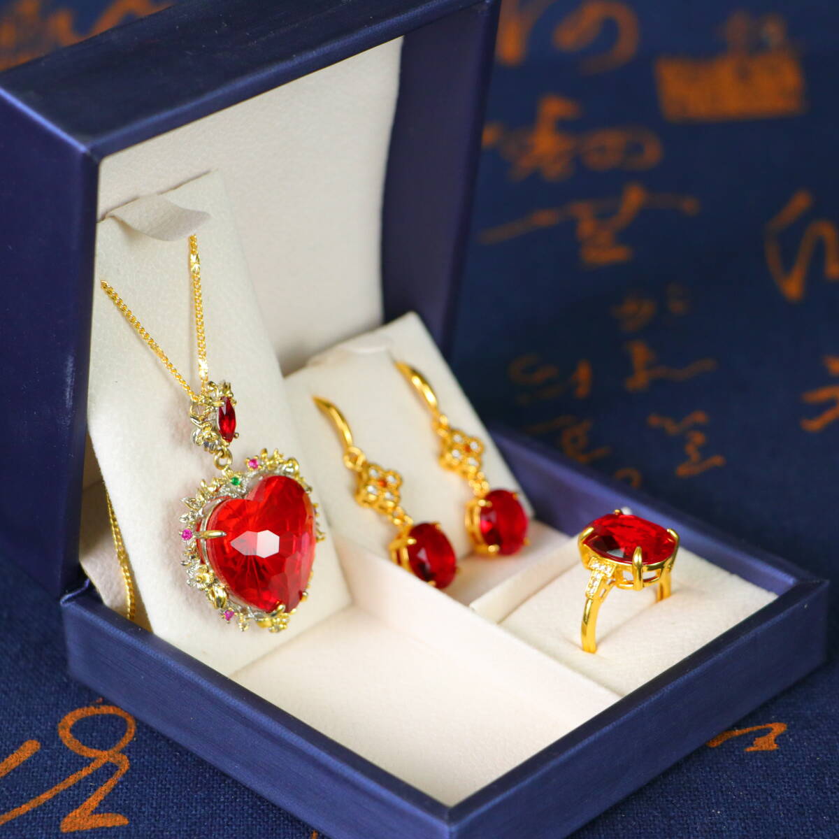 - 清 宮廷御製 古高冰宝石嵌 心形 紅宝石 項鏈 戒指 耳釘 三件套 箱付 極細工 東洋彫刻 中国唐物 骨董品 古賞物 中国古玩 中国古美術