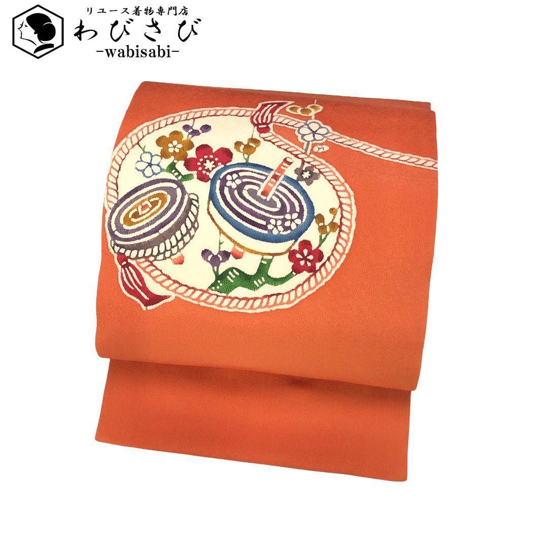 - 名古屋帯 型染 独楽 梅の花 縮緬 赤橙色 長尺 O-5106 着物 きもの kimono 和服 和装 中古 リサイクル着物 【送料無料】