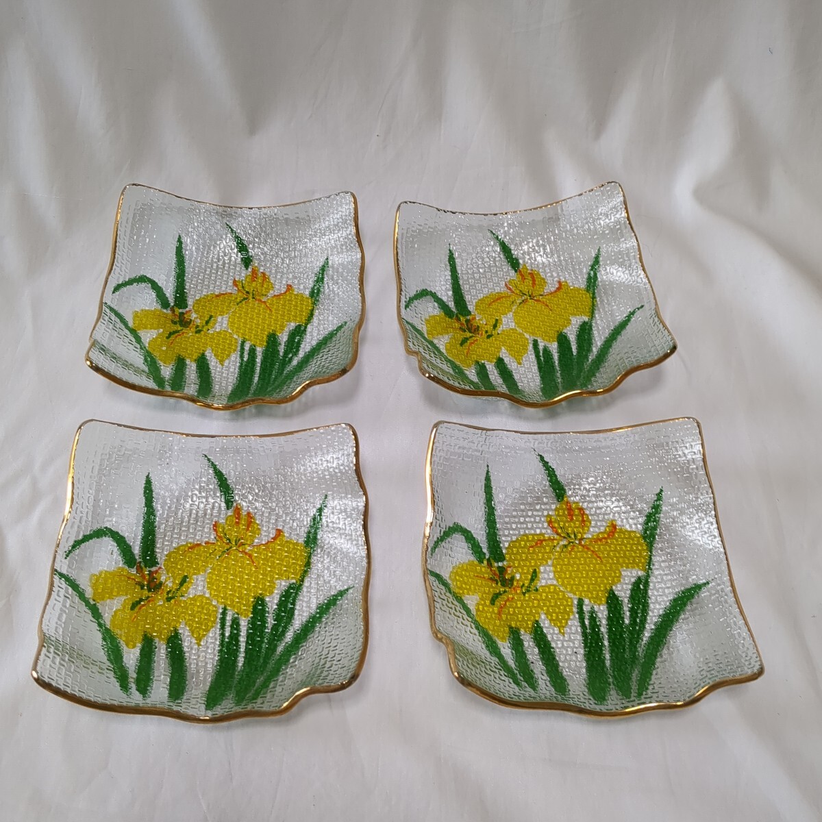 - 使用品★ガラス皿 花柄 角皿 銘々皿4枚☆