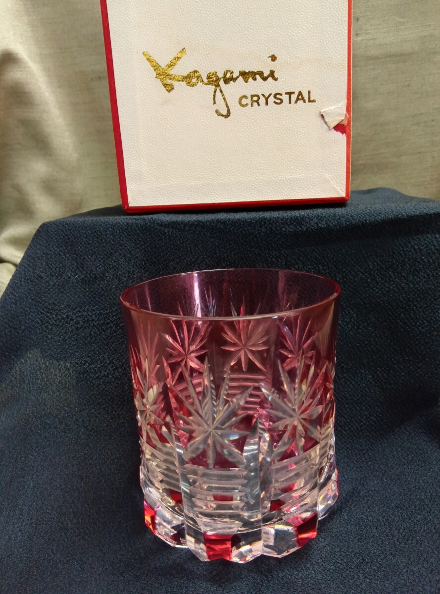 - 金の鈴 カガミクリスタル 赤色被せ切子 ロックグラス ロゴ マーク刻印有り 希少 廃盤品 未使用