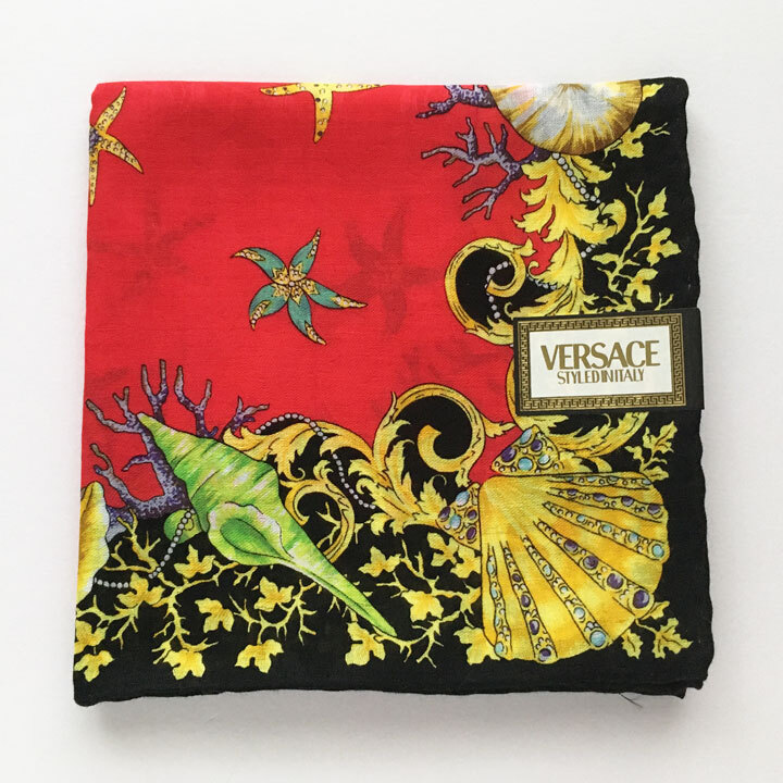 - ヴェルサーチ / VERSACE ハンカチ シェル&ヒトデ柄 透かし入り赤/黒生地【6351】