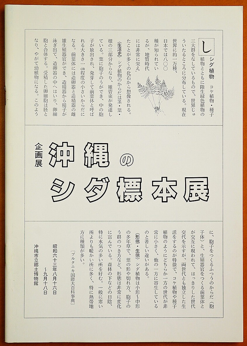 - 企画展 沖縄のシダ標本展 沖縄市立郷土博物館発行 図録1冊 昭和63年 検:琉球産シダ植物目録 分布北限 固有種 胞子のう群 生育環境