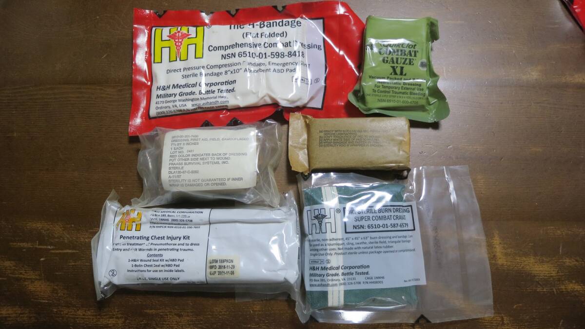 - 米軍放出品 実物 FIRST AID 圧縮包帯、ガーゼ、6点セツト D-185