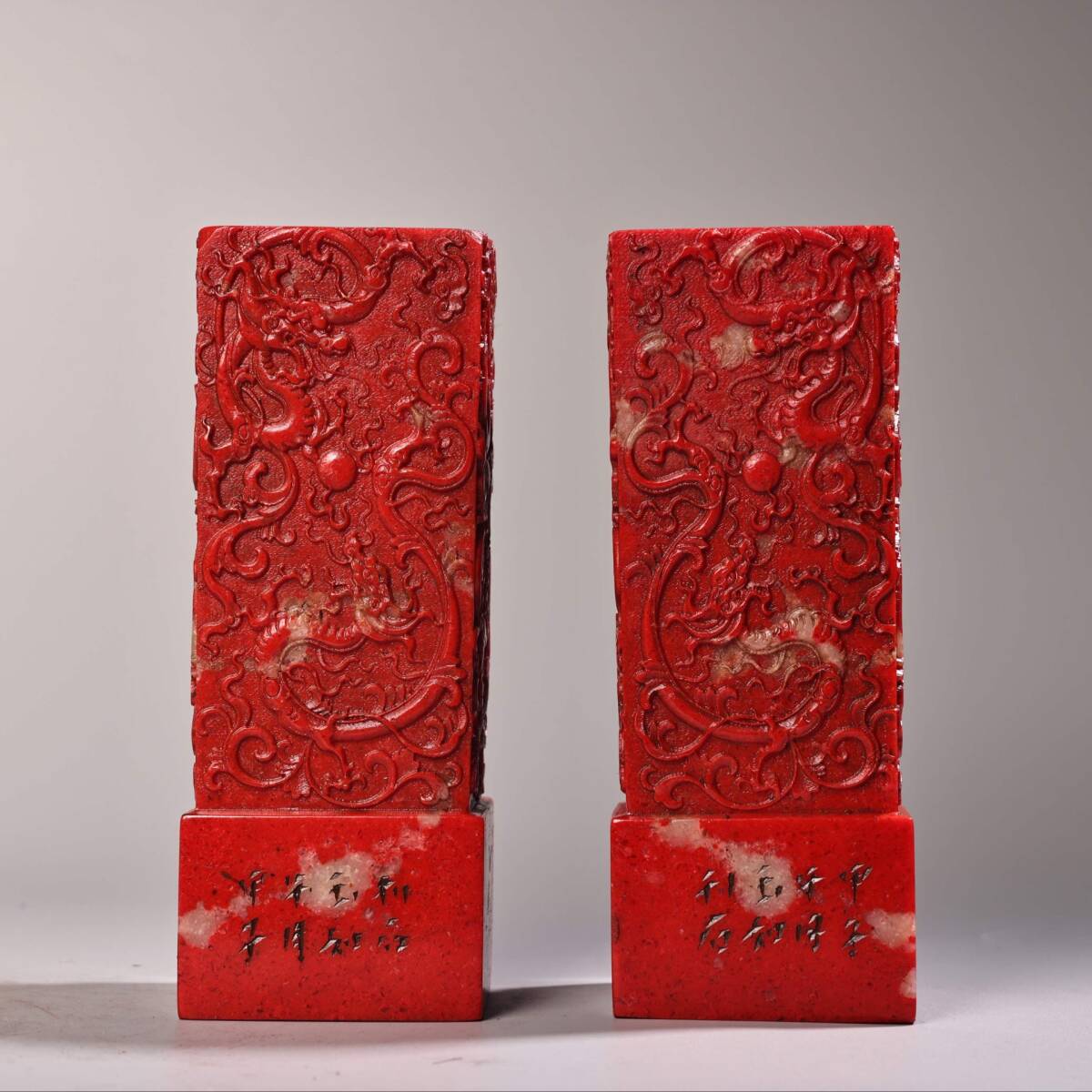 - 蔵友旧蔵出 寿山石 鶏血石 大紅袍 細密彫 二龍戲珠紋 印章一對 箱付 貴重品 置物 賞物 中国時代美術品