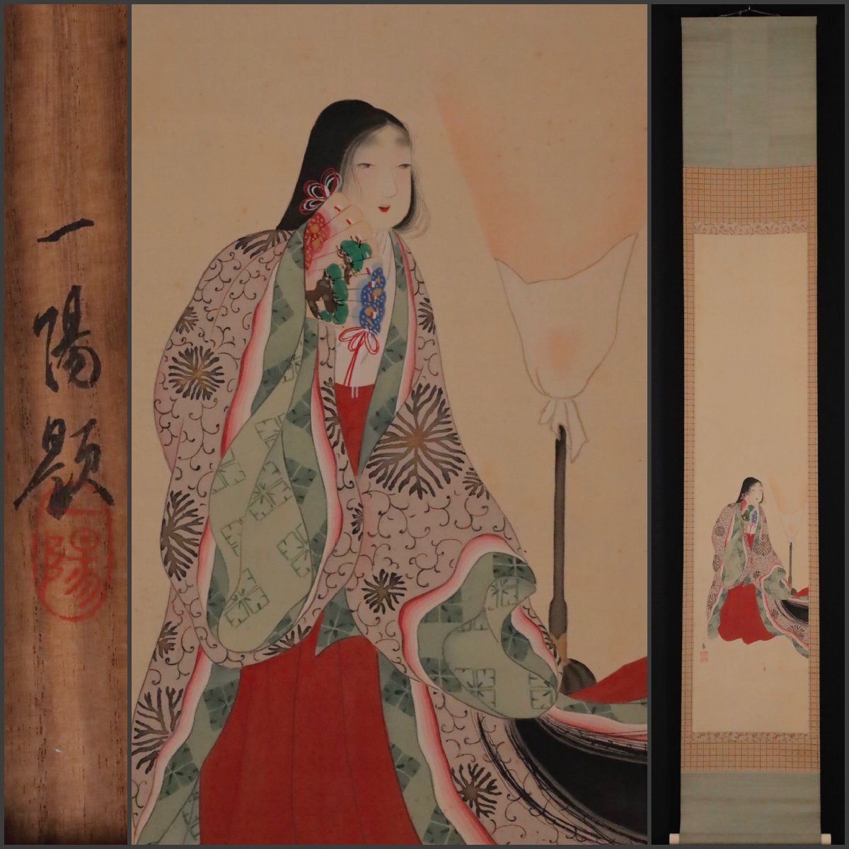 - 【模写】吉】12454 奥谷一陽 徒然 美人図 共箱 奥谷秋石の嗣子 茶掛け 茶道具 大和絵 風俗画 物語絵 平安人物 掛軸 掛け軸 骨董品