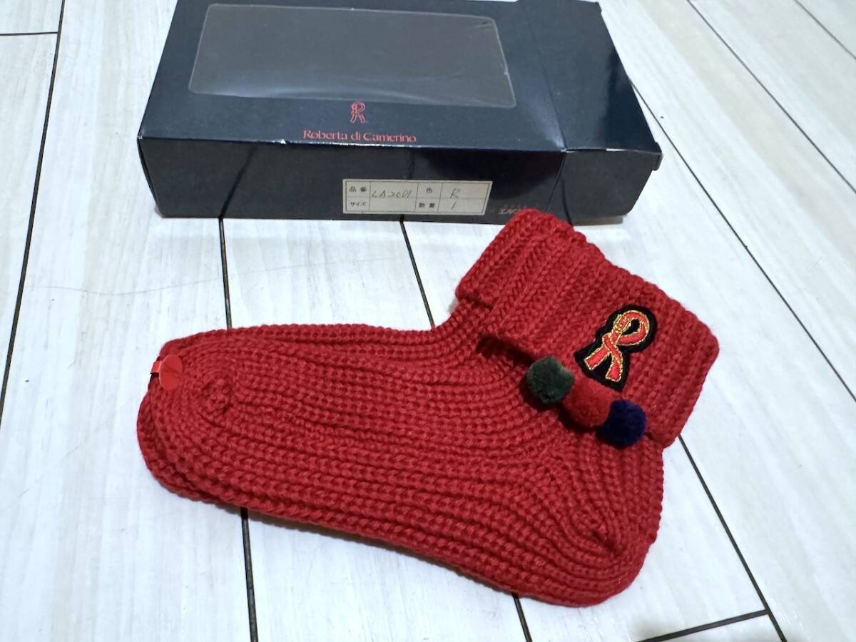 > 【未使用・箱付】Roberta di Camerino ニットスリッパ ルームシューズ 赤 Rロゴ ポンポン付 昭和レトロ