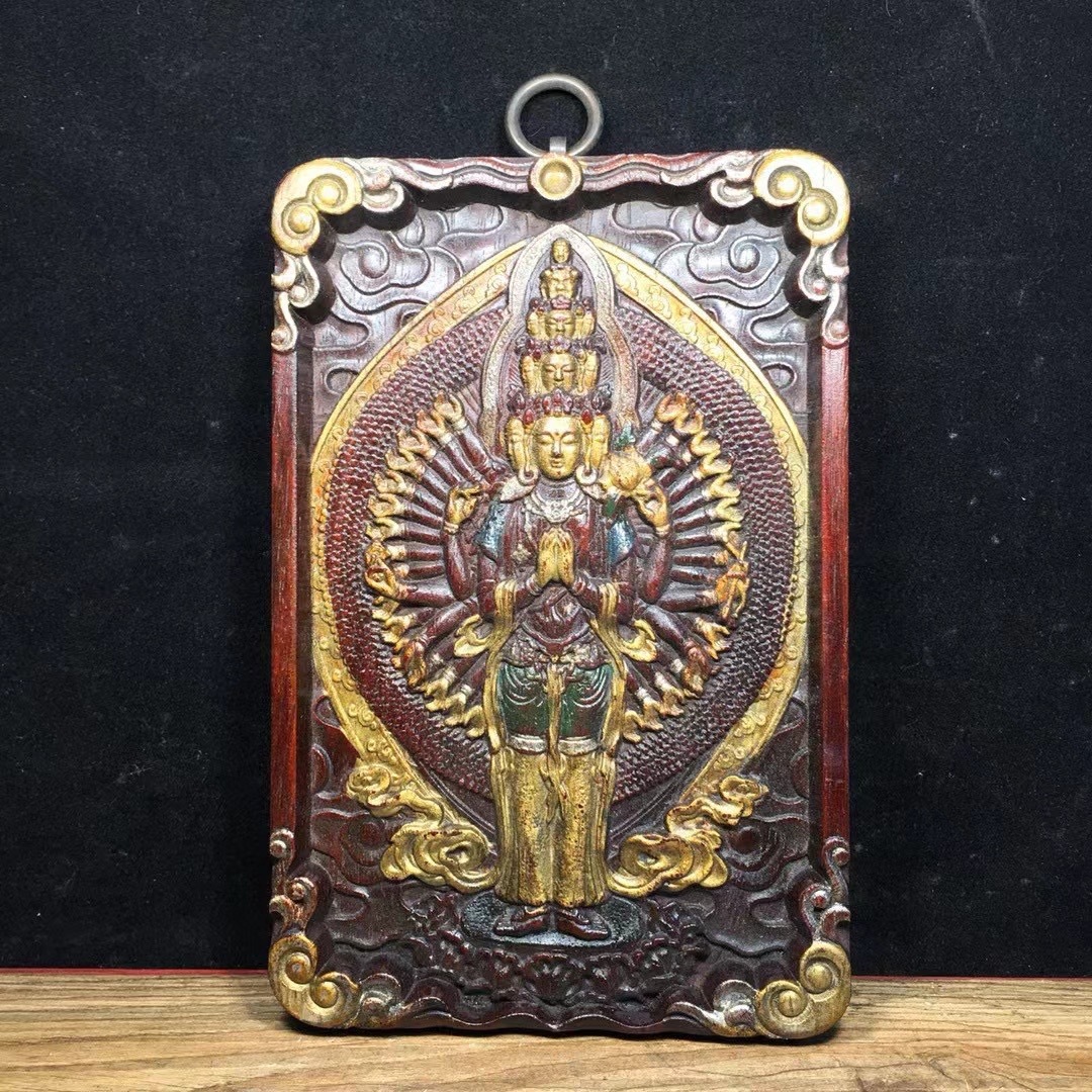 - 早期收集 古紅木彫 仏教古美術 彩絵 千手観音 仏像 壁挂 墻挂 古擺件 時代物 古董品 骨董 旧家蔵出し 唐物 中国古玩 古美術品
