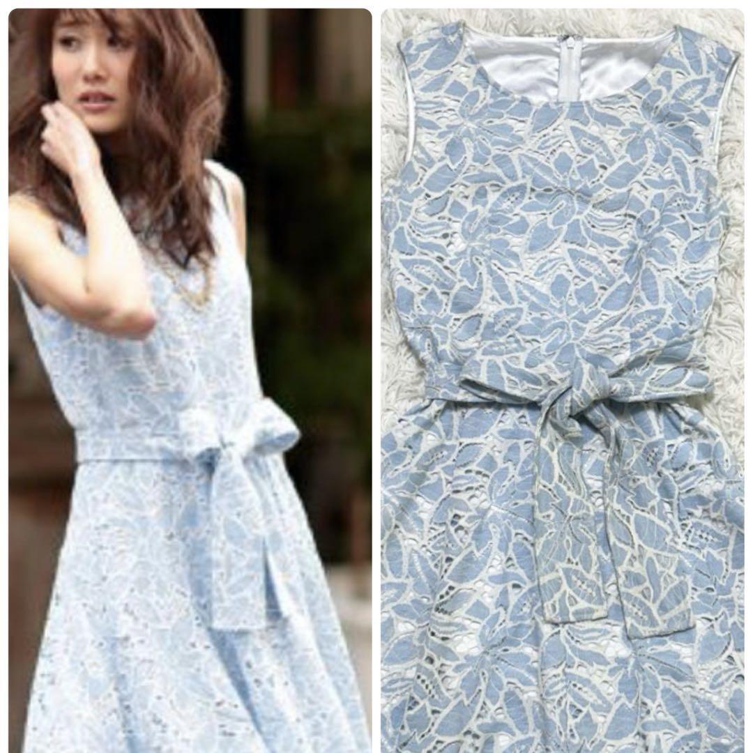 - ANAYI アナイ ツートンラッカバンレース フレア ワンピース 花柄 刺繍 膝丈 ドレス フラワー柄 Aライン ライトブルー 36 水色