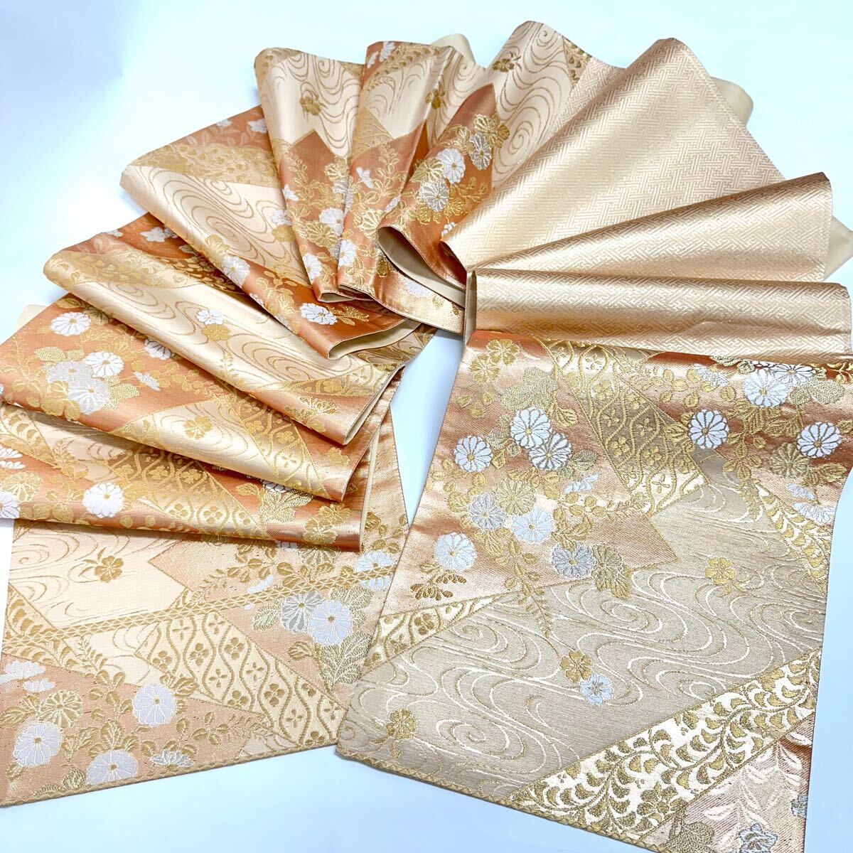 - 【七福】c565 逸品 高級品 正絹 袋帯 六通 観世水 菊 裂取り 金糸 銀糸 刺繍 豪華