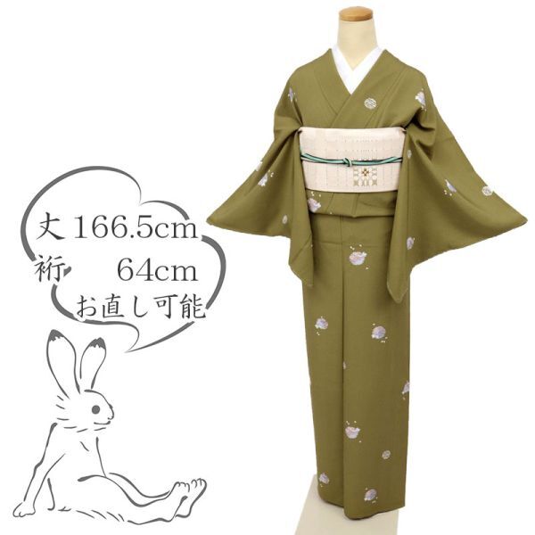 > 【小紋】 長尺 単衣 シンプル雪輪に花兎 カーキグリーン 正絹着物 KG5-4