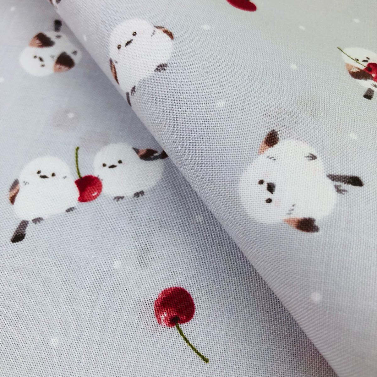 - 1m シマエナガ さくらんぼ シーチング 生地 108×100 綿生地 薄グレー 小鳥