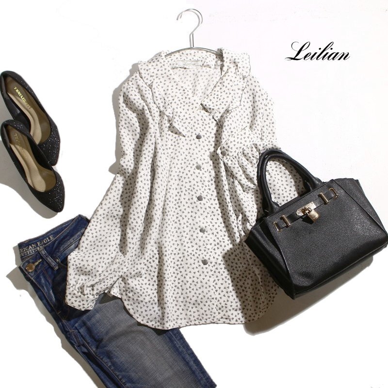 > 美品 レリアン Leilian 春 夏 ほんのり艶 艶柄 × 三角 ドット 柄 フリル 三角襟 ミセス ゆったり 長袖 ブラウス シャツ ホワイト グレー