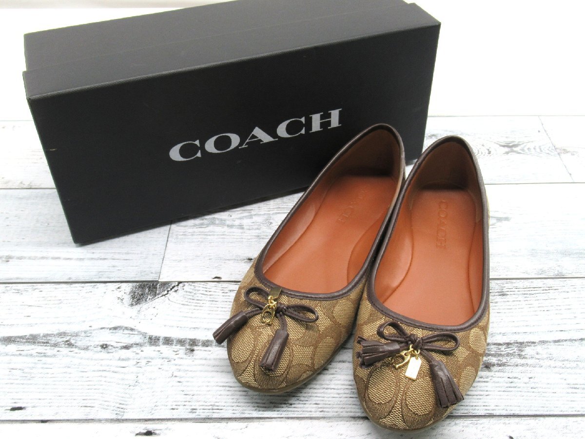 - ☆【B送900円】1852 COACH コーチ シグネチャー フラットパンプス バレエシューズ レザーリボン ゴールド金具 ブラウン系 23㎝