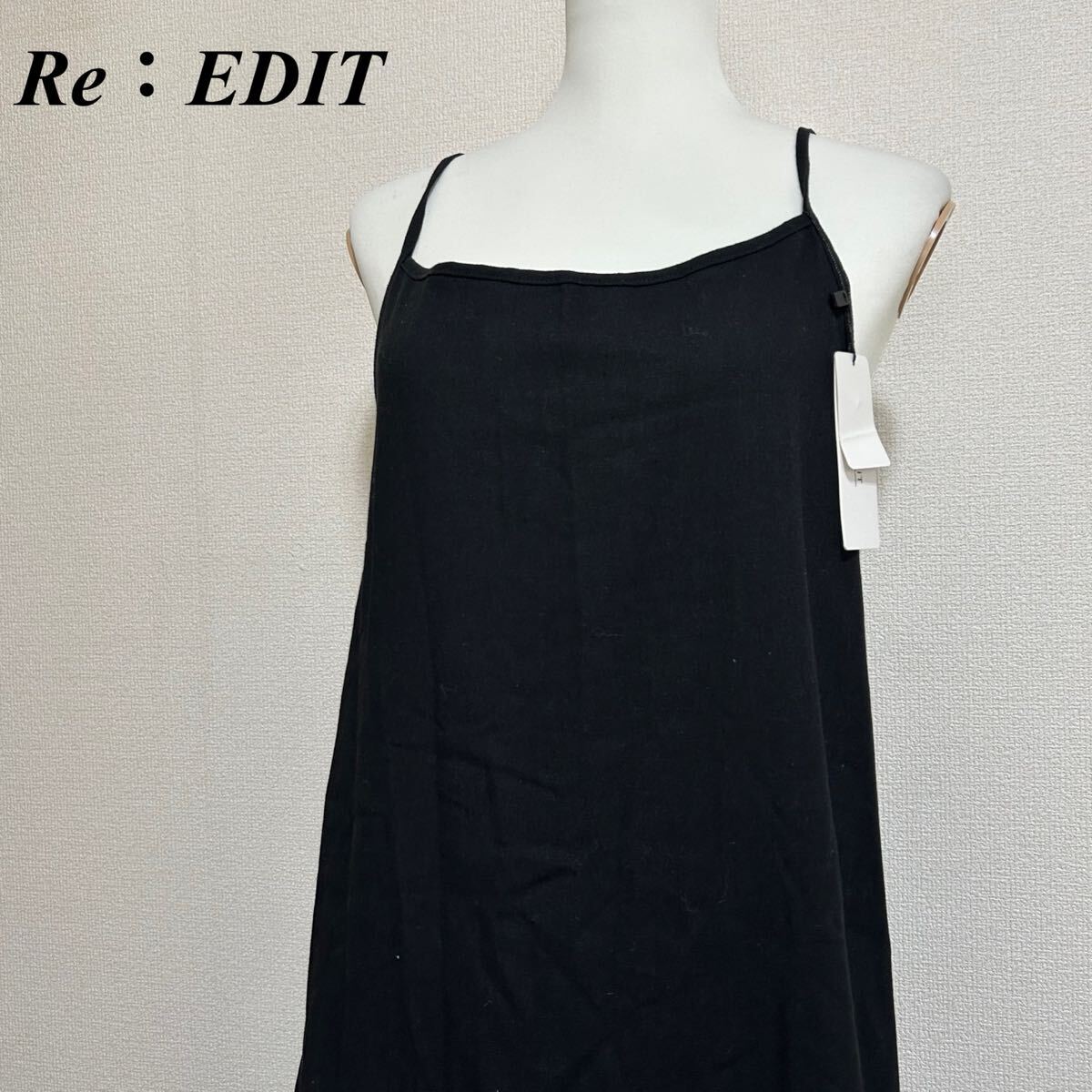 - 新品タグ付き キャミソール リネン 麻混 キャミソールワンピース ノースリーブ マキシ丈 ワンピース リボン 春夏 夏用 黒 ブラック Lサイズ