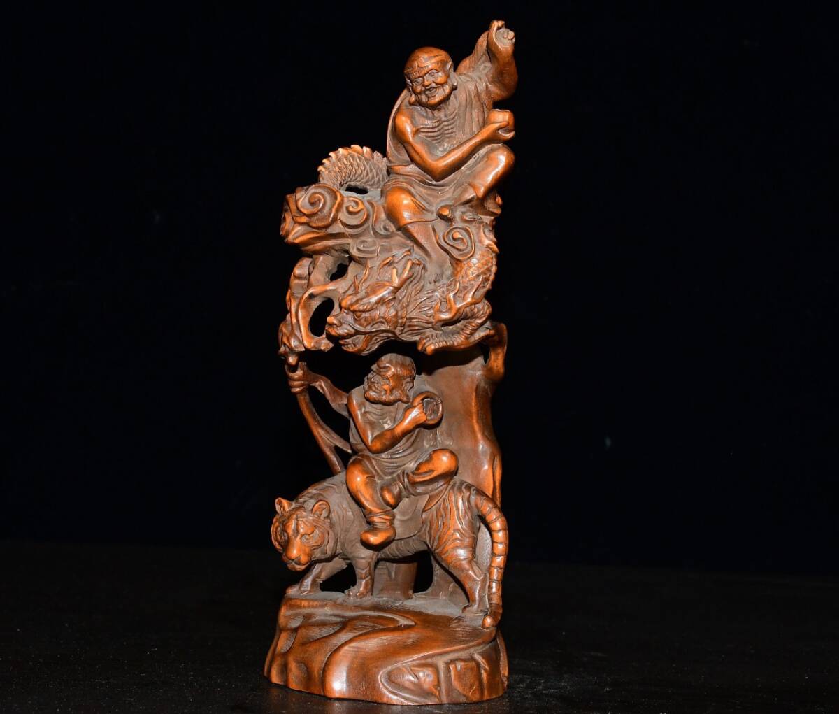 - 蔵友旧蔵出 黄楊木製 細密彫 降龍伏虎像 極細工 希少珍品 置物 古賞物 中国古玩 中国古美術品