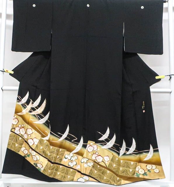 - 《古美術京松》【着物】黒留袖 五つ紋 比翼仕立て 作家物 落款入り 金駒刺繍 鶴・枝梅文 身丈約156cm 裄丈約64cm r7z06-605