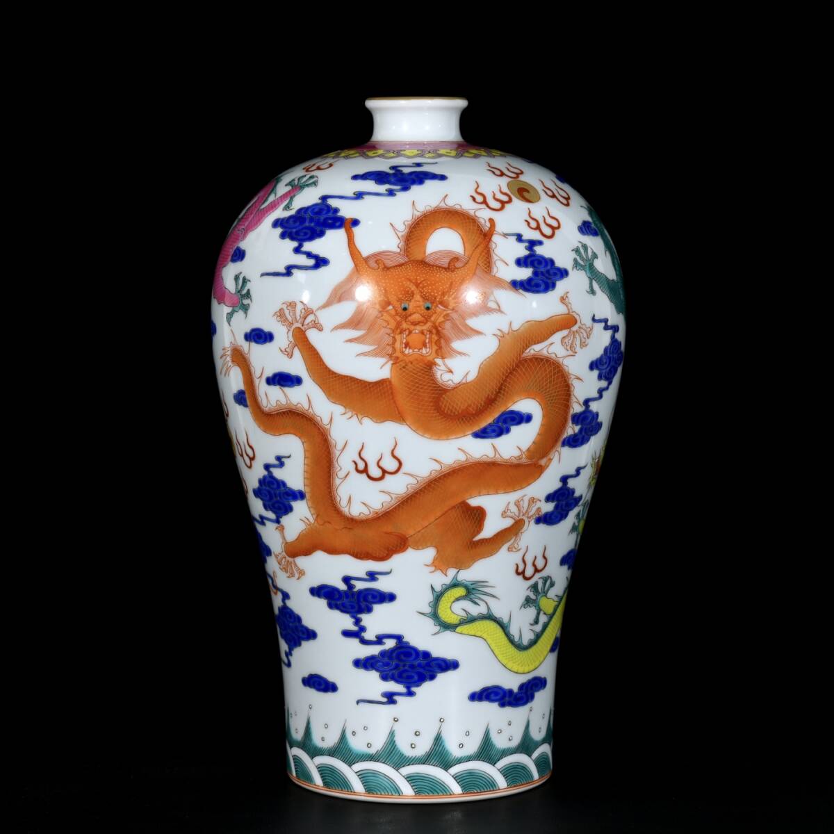 - 多宝閣 ■ 202248 中国磁器 中国骨董【清雍正五龍文エナメル梅花瓶】工芸品 施釉陶 陶芸 置物 收藏品 孤品