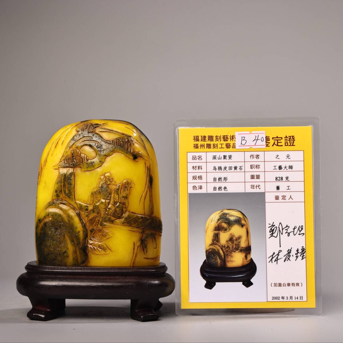 - 蔵友旧蔵出 寿山石 烏鴉皮 田黄石 細密彫 深山聚賢紋 印章 箱付 貴重品 稀少物品 置物 賞物 中国時代美術品