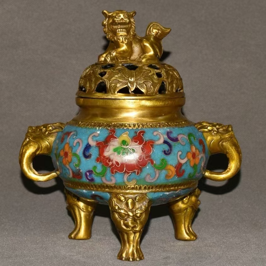 > 仏像 清代 乾隆年制 旧蔵 チベット古寺 古銅景泰藍糸エナメル彩双竜獅子薫香炉 銅製 銅琉金 唐物 收蔵品 時代物 古置物 供養品 文房具6.15