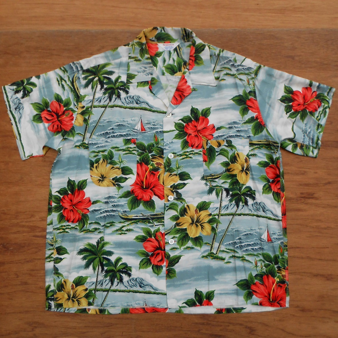 - '60s SPORTS WEAR ハワイアンシャツ 半袖 L 16-161/2 日本製 オリジナル 当時物 アロハシャツ 総柄 ハイビスカス 昭和 ヴィンテージ 白x灰