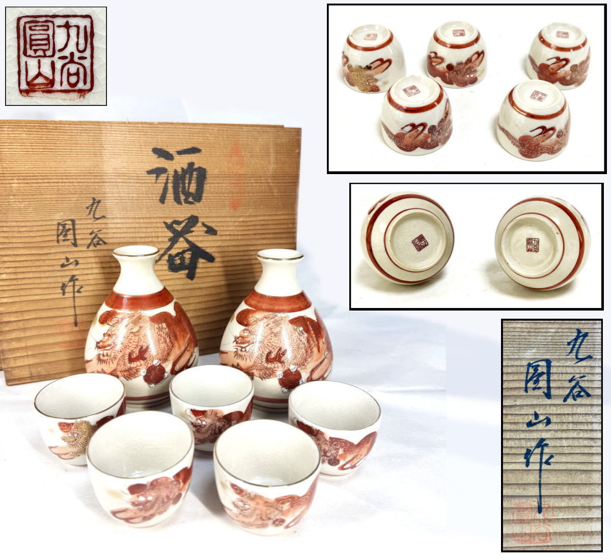 > 【送料無料】九谷焼 圓山作 日本酒 セット 酒器 お銚子2本 お猪口5個 共箱 晩酌 焼物 入手困難 骨董 日本古玩 (旧家蔵出し) WWTT377